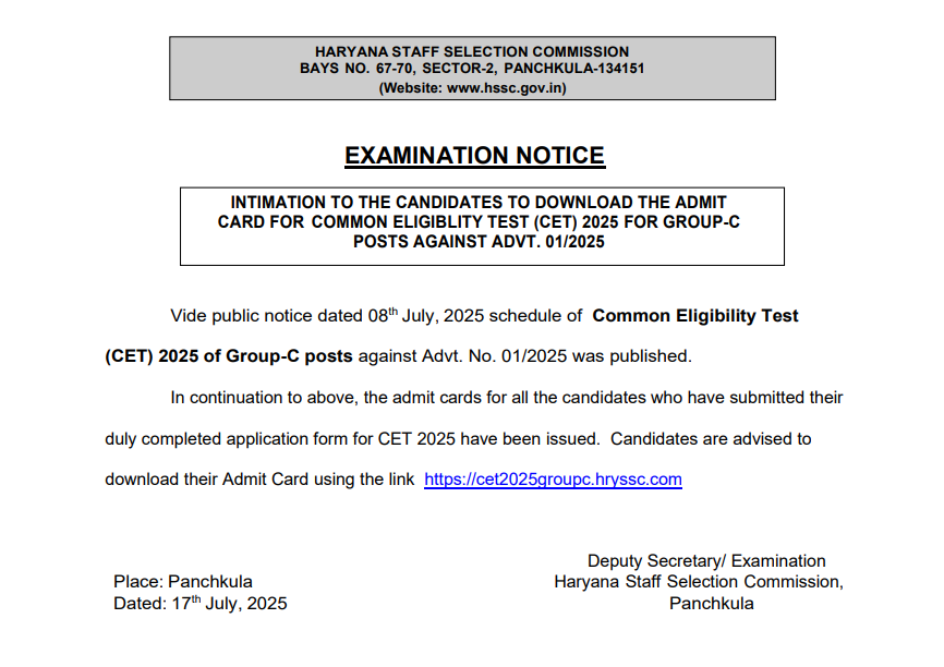HSSC ने 8 जुलाई 2025 को CET 2025 के शेड्यूल से संबंधित नोटिस जारी किया था। उसी के continuation में अब 17 जुलाई को एडमिट कार्ड जारी कर दिए गए हैं।